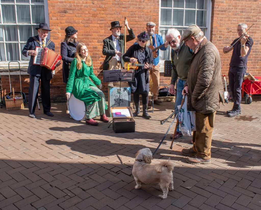 The sun shone on the righteous this morning… no, not the band, but the good burghers and burghesses of Lichfield who passed along Dam Street (yes, there was a busker already at our favoured spot in Market Street, and a very accomplished busker by all accounts) and chose to add their contributions to our hat box. Most generous they were.