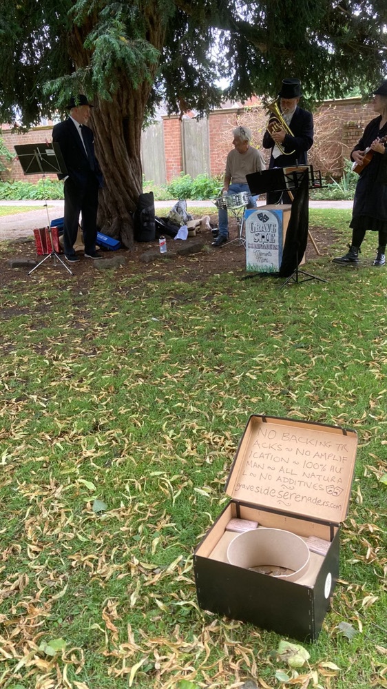Not only did the Graveside Serenaders brave the drizzle on Saturday, we expanded our horizons and busked not only beneath the home-from-home Yew beside Minster Pool in Lichfield, but also beneath another tree in Beacon Park, not far from Capt Smith, of the Titanic, and the budding Djokovics and Bartys smashing them back and forth on the tennis courts. The passing Fuse Festival crowds looked a little bemused, but the children – and the dogs! – seemed to really dig what we were doing.